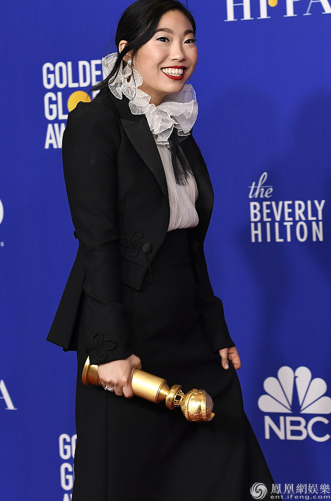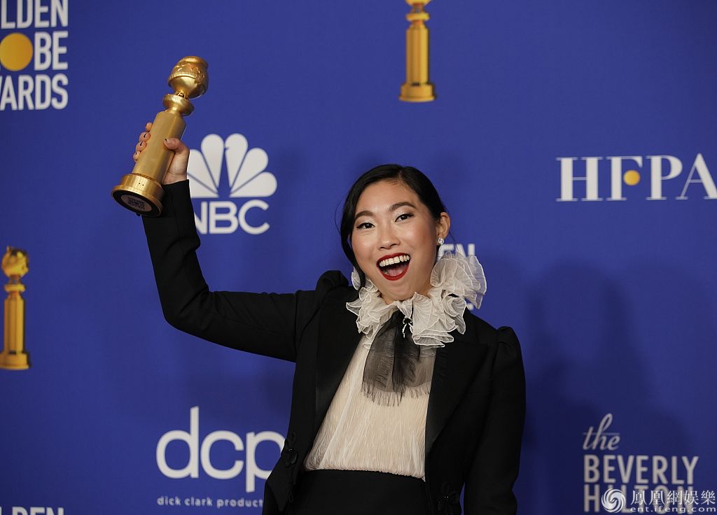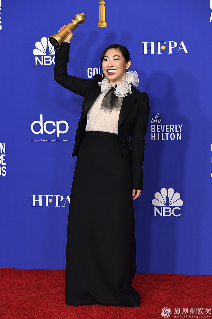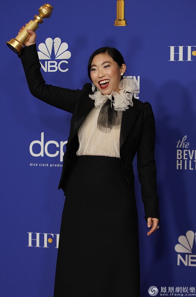 奥卡菲娜喜提奖杯笑容满面,她也是金球奖首个亚裔喜剧影后。