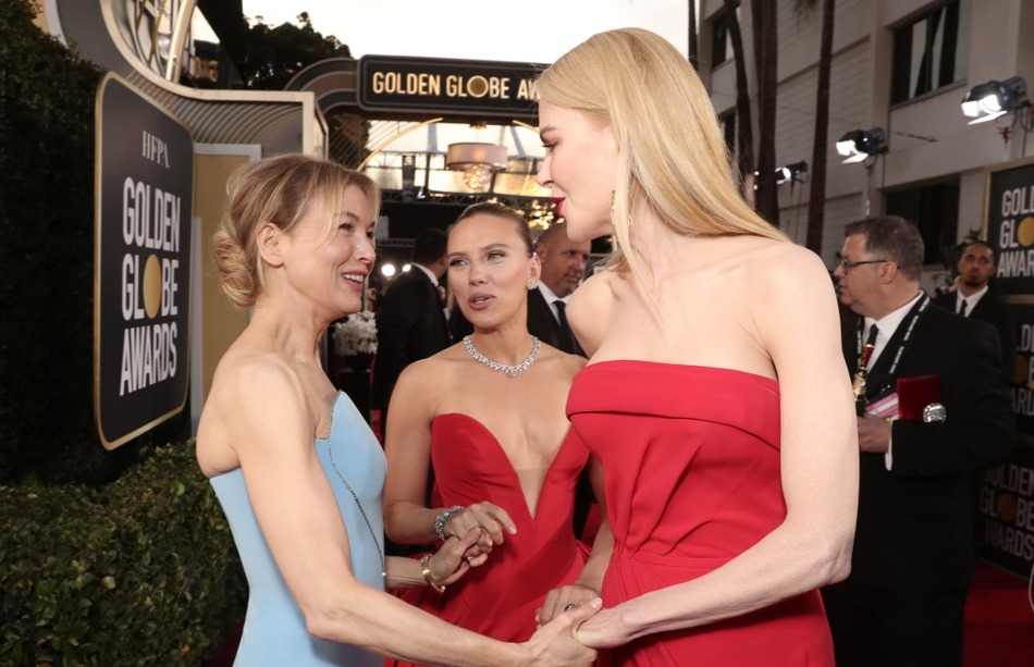 北京时间1月6日上午(美国1月5日晚),第77届美国电影电视金球奖颁奖礼在洛杉矶举行。蕾妮·齐薇格、妮可·基德曼、斯嘉丽·约翰逊三大女神在红毯前牵手热聊,笑容动人,画面养