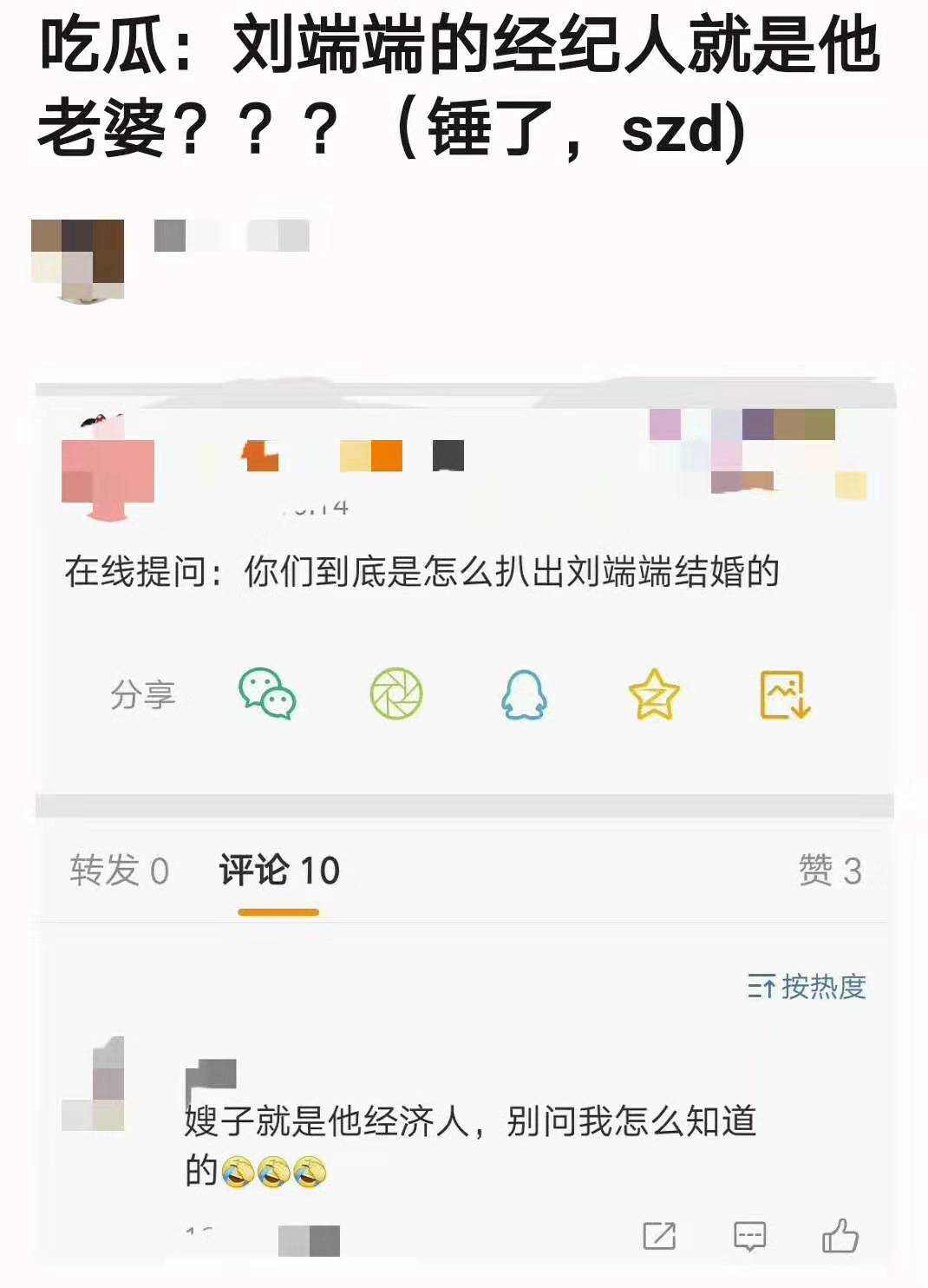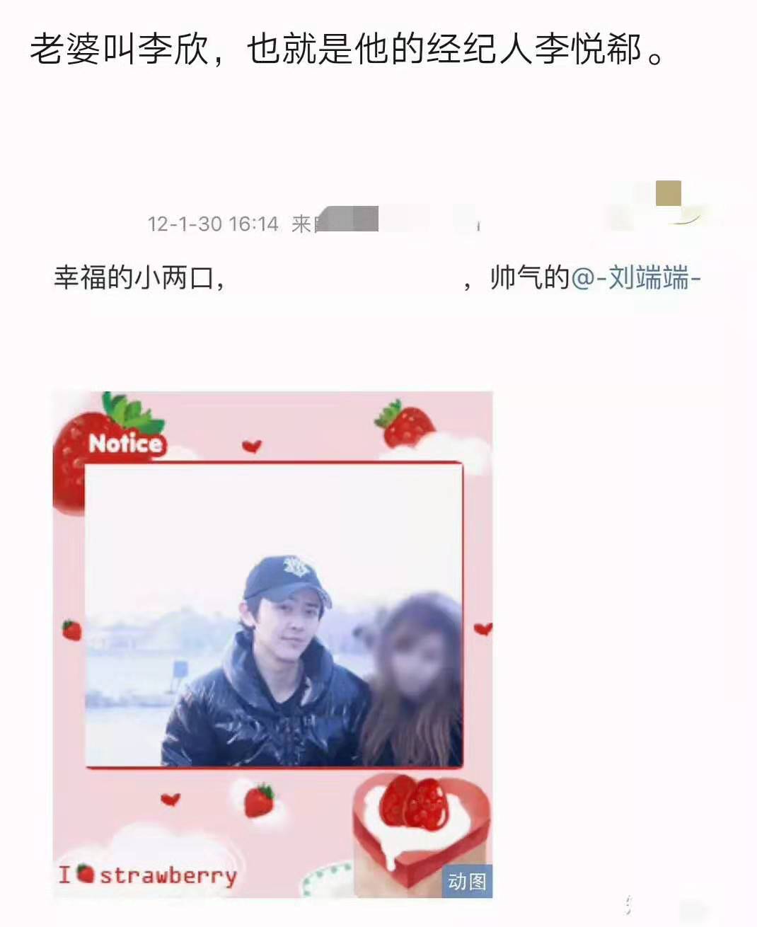 随后,还有疑似是刘端端与妻子的合照被人爆出,这张照片上的男性颇有刘端端20岁出头的样子,晒照者还不忘配文:“幸福的小两口”,还艾特了刘端端。