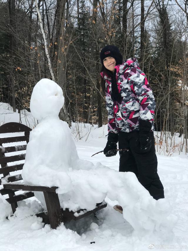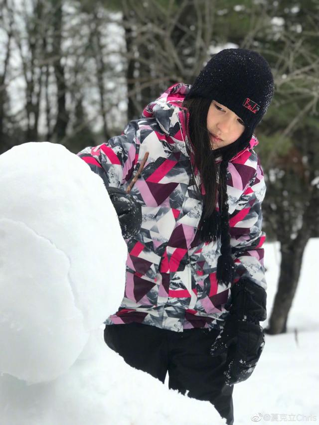 久未露面的夏天当天身穿花色羽绒服造型,头戴针织帽正在认真的堆雪人,长发飘飘的造型让不少网友大呼夏天长大了!