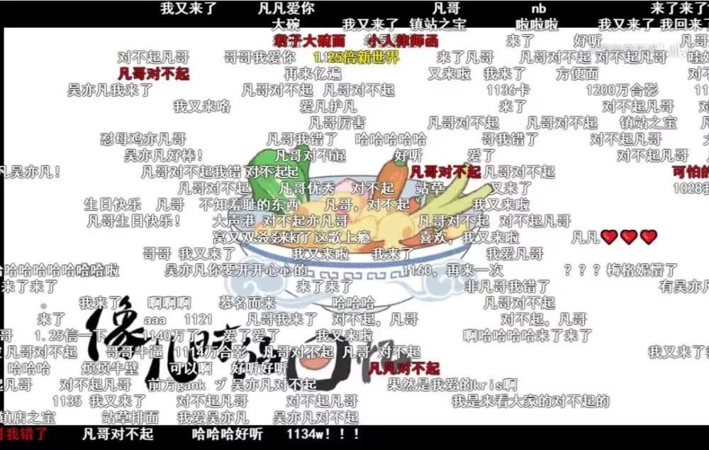 唱到最后,弹幕里突然出现了“前方高能,全体起立”的口号,原来吴亦凡要唱出最著名的那两句歌词了:“你看这个面它又长又宽,就像这个碗它又大又圆。”