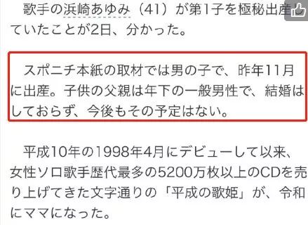 消息称,41岁的滨崎步去年11月(害!也就是19年啦,刚进入新年,还真有点不习惯)生下一个男孩,孩子的父亲是一位普通的年下男,滨崎步并未与该男子结婚,并且此后也无结婚打算。