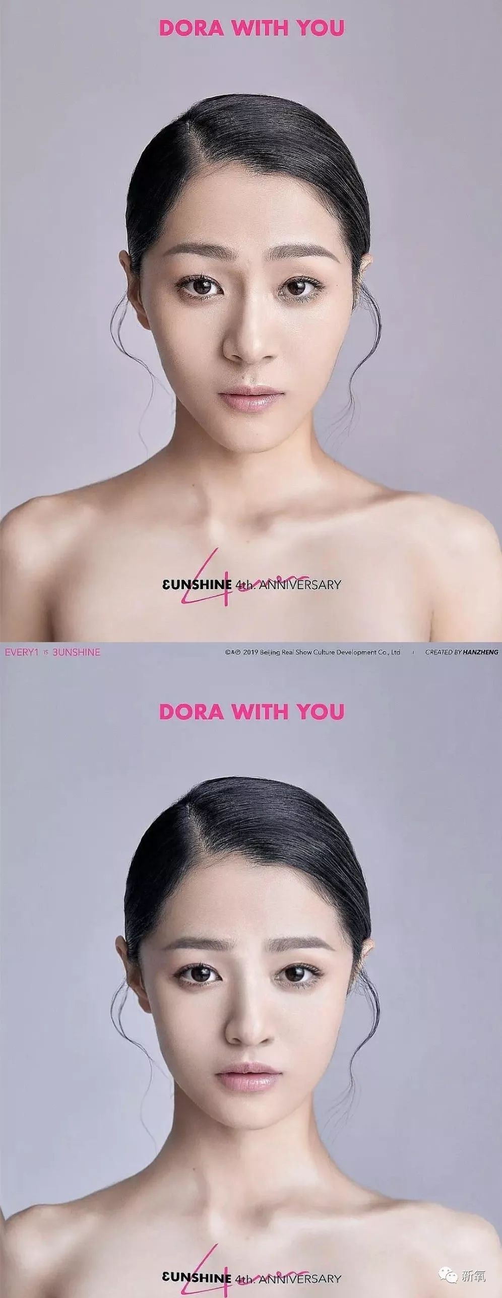 羊观察了半天下面这组对比图,发现Dora也只改动了两个地方,一个是最小程度的填了点上眼睑、另一个是最小程度的丰满、缩短面颊比例,让其看起来更年轻化。