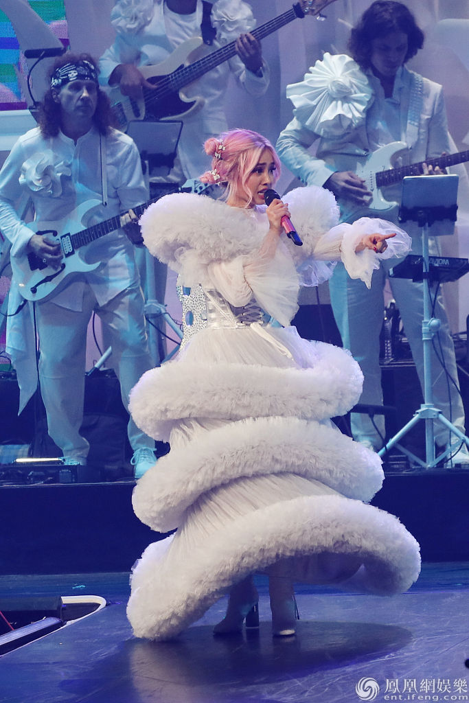 蔡依林身穿浮夸的白色蛋糕裙,宛如童话世界走出来的公主,再搭配舞台上纯白花园造景及大型兔子、白马等道具,气氛超甜;