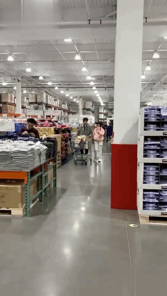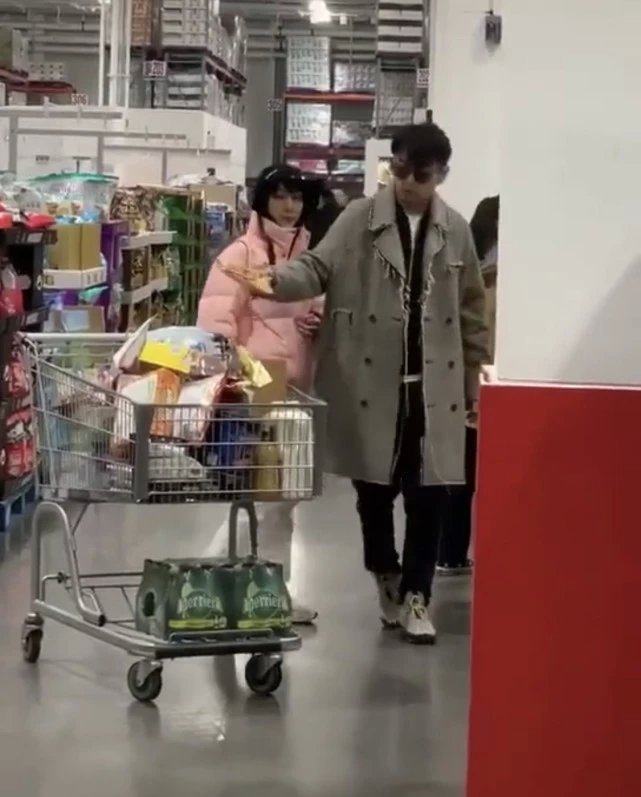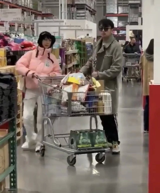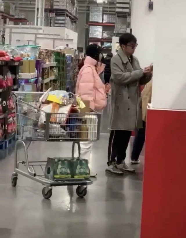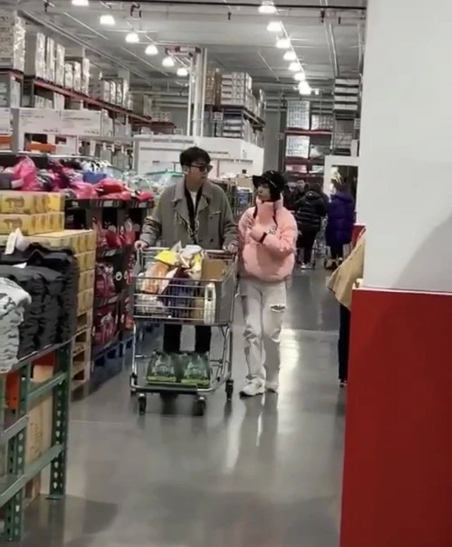 视频是在上海costco超市拍的,雷佳音与老婆翟煦飞一同推着购物车扫货。