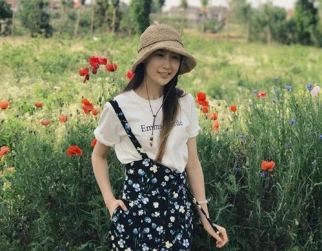 飞姐戴着黑色毛线帽,穿着粉红色立领羽绒服,白裤子配白球鞋,整体色调清淡又可人。