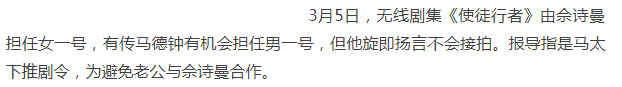 据悉,之后的无线剧集《使徒行者》由佘诗曼担任女一号,有传马德钟有机会担任男一号,但报导说,马太下推剧令,为避免老公与佘诗曼合作。