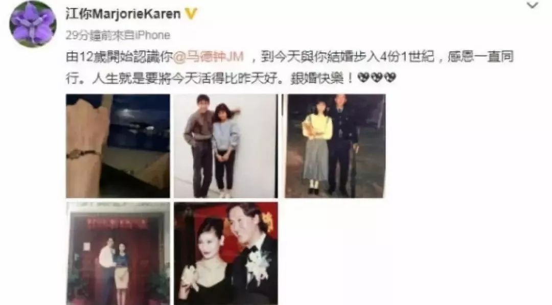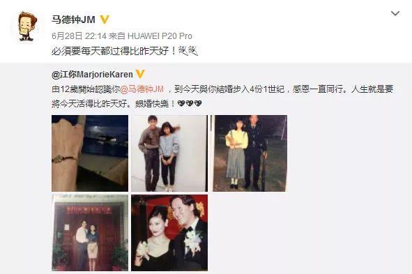 当日马太太在微博上载了多张两人由拍拖到结婚的相片,并留言说:“由12岁开始认识你,到今天与你结婚步入四分之一世纪,感恩一直同行。人生就是要将今天活得比昨天好。银婚快乐!”