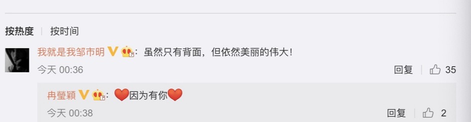 随后,邹市明转发评论:“虽然只有背影,但依然美丽的伟大!”很快冉莹颖也甜蜜回复:“因为有你。”