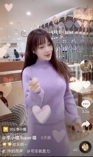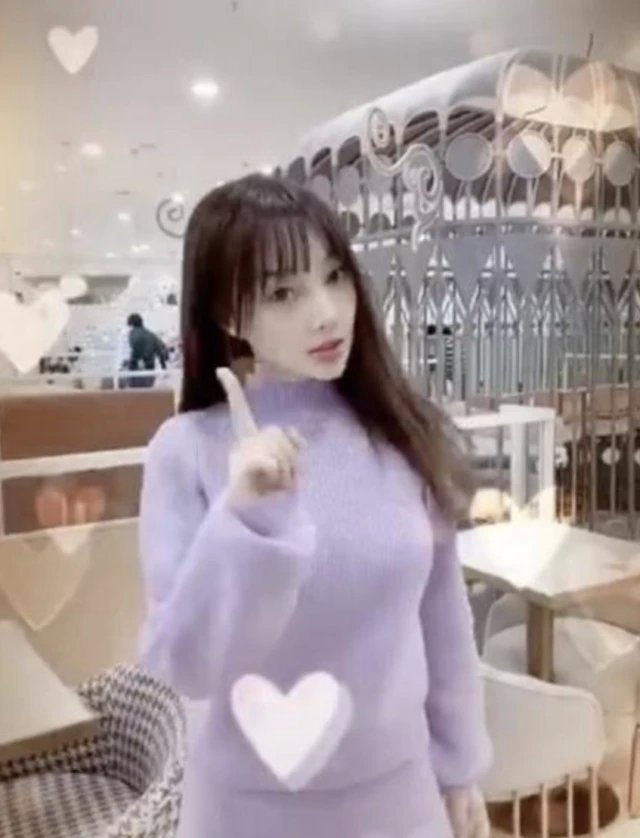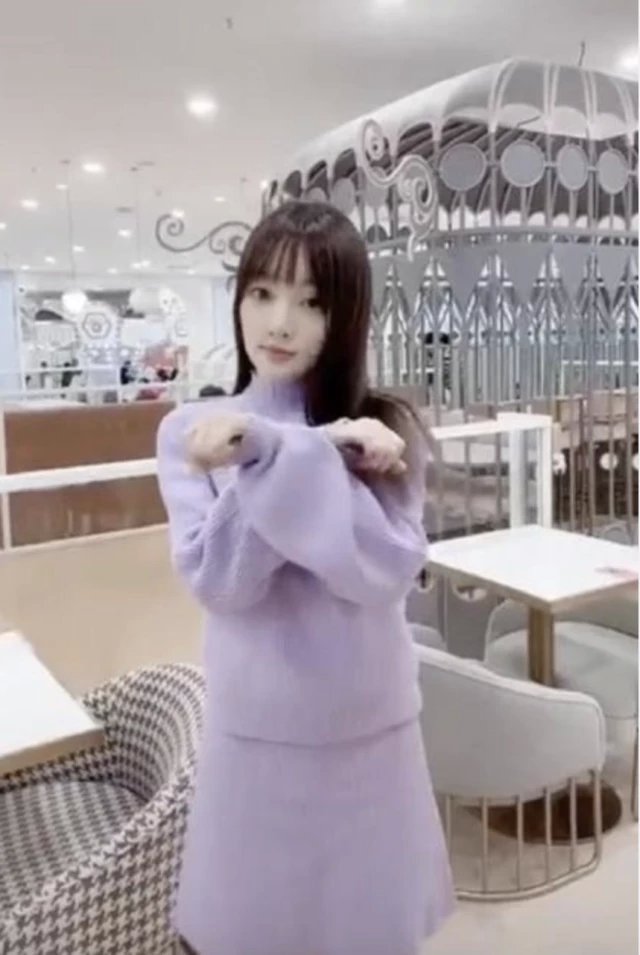 视频中的她留着齐刘海长发,穿着时下很流行的香芋紫色针织套装,不停地对着镜头嘟嘴眨眼转圈圈。