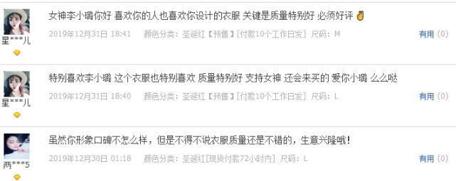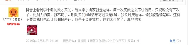 最新的评价是2019年12月31日的,“网上看见李小璐同款才买的,结果李小璐家就是这样,第一次买就这么不讲信用,只能说没有下次了,比别人的贵就不说了,明明买的M号结果寄过来是L号。不要给我打电话让我删掉差评,我是不会删掉的,你们太可笑了。”