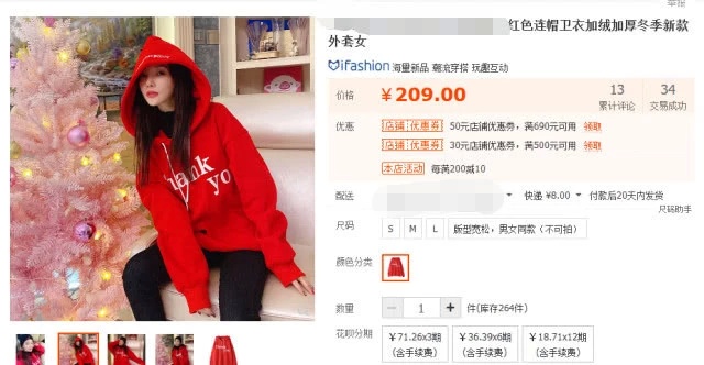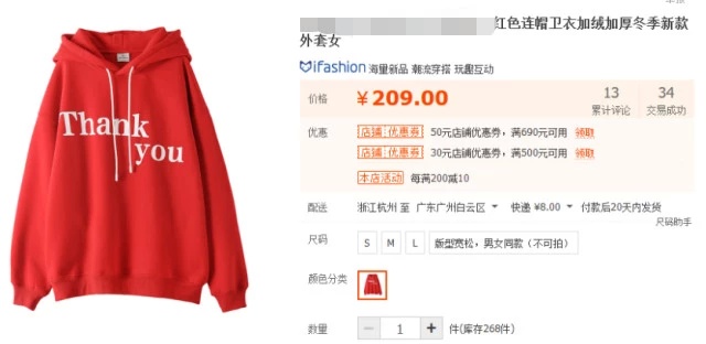 该店销量最高的是一件红色连帽加绒卫衣,胸前印有“Thank you”,男女都能穿。