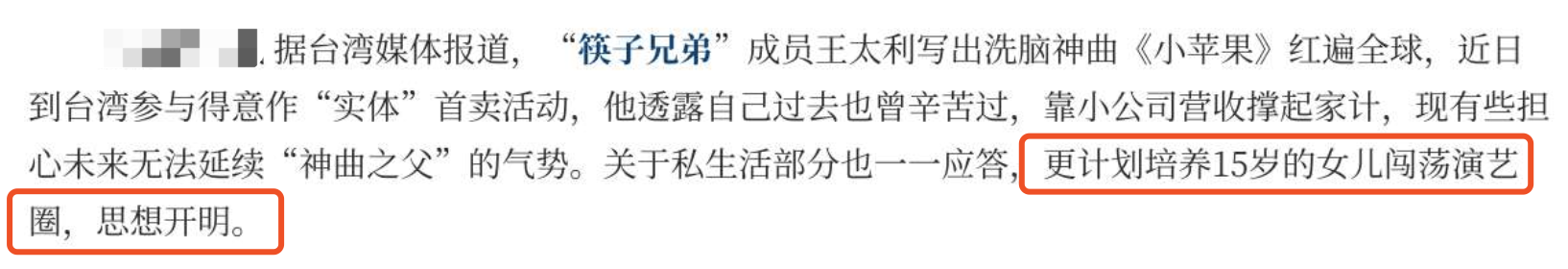 王太利对女儿的培养也一直都很看重,3年前接受采访时,王太利还透露女儿遗传了自己的音乐天赋,自己平日里有特意教女儿钢琴、吉他等各种乐器,发掘她的音乐才能,也有让女儿出道的想法。