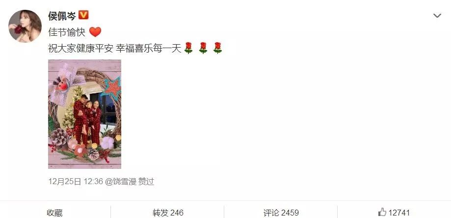 日前,侯佩岑首次晒全家福,并配文:佳节