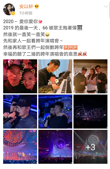 1月2日,安以轩晒出一组跨年的照片,并配文:“2020~爱你爱你,2019的最后一天,66被歌王抱着弹钢琴,然后就一直笑一直笑,先和家人一起看跨年演唱会~然后再和歌王们一起倒数跨年,幸福的听了第二场的跨年演唱会的意思