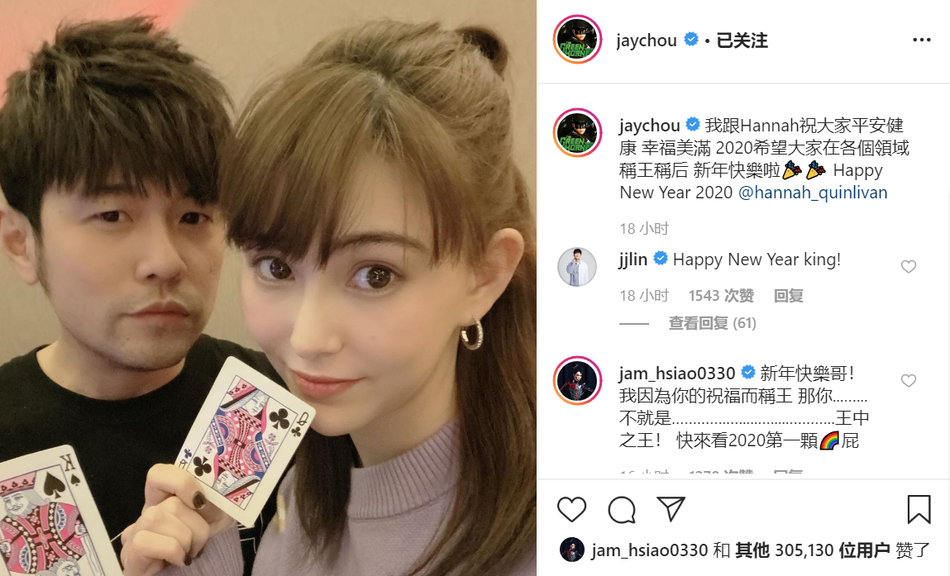 周杰伦也晒照称:“跟Hannah祝大家平安健康、幸福美满,2020希望大家在各个领域称王称后,新年快乐啦!”