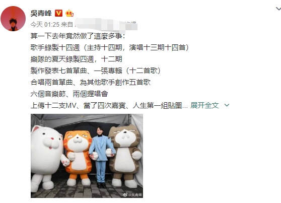 吴青峰在发文中细数一年来参与的节目录制、制作的音乐作品、演唱会、采访等工作,并感叹:“日日排练、锻炼,一场人生的浩劫。”他回忆自己成长的经历,提到自己曾面对成长环境的家暴、大学时的忧郁症、攻击人身的网络言语、身边暗中整自己的前辈等挫折,更坦言:“我没想到我还能有更崩溃的时刻。”