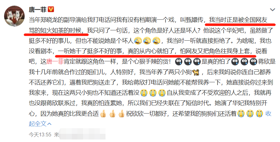 1月1日,唐一菲突然在个人社交平台发长文,解释自己拒演《甄嬛传》华妃一事,引起了巨大争