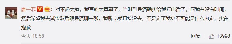 随后,唐一菲就发长文回应丈夫在节目中的言论。她说自己当时正是被全国网友骂得如火如荼,得知华妃并不是一个正面角色时就直接拒绝了,连剧本都没有看过。因为她害怕网友把华妃的心狠手辣往自己身上套,招致更多骂声和批评,因此拒绝。