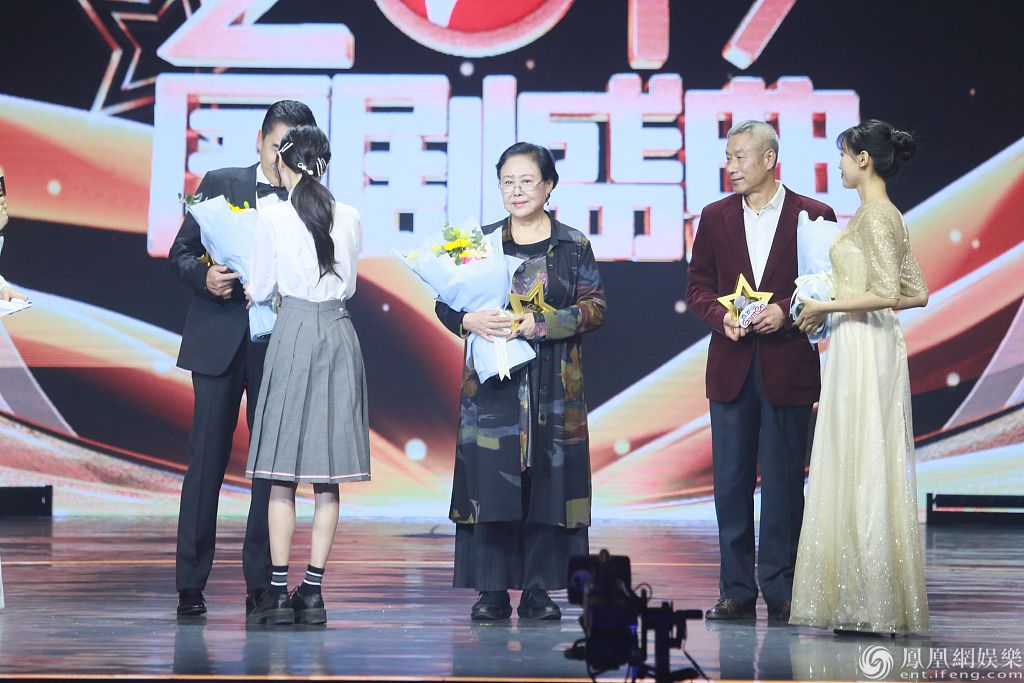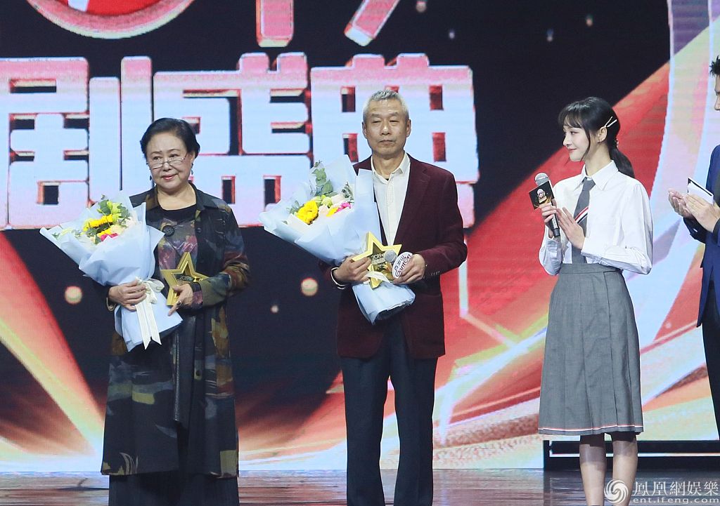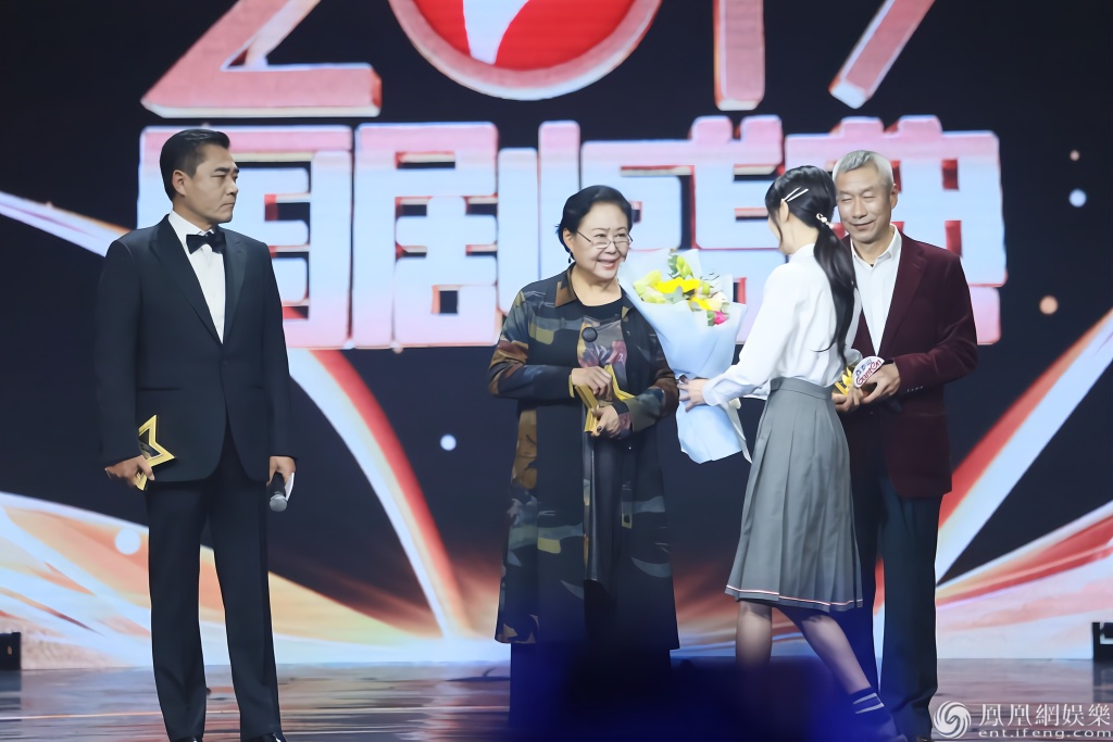 郑爽爽作为青年演员代表,向三位前辈斯琴高娃、陈宝国、刘佩琦献花致敬。