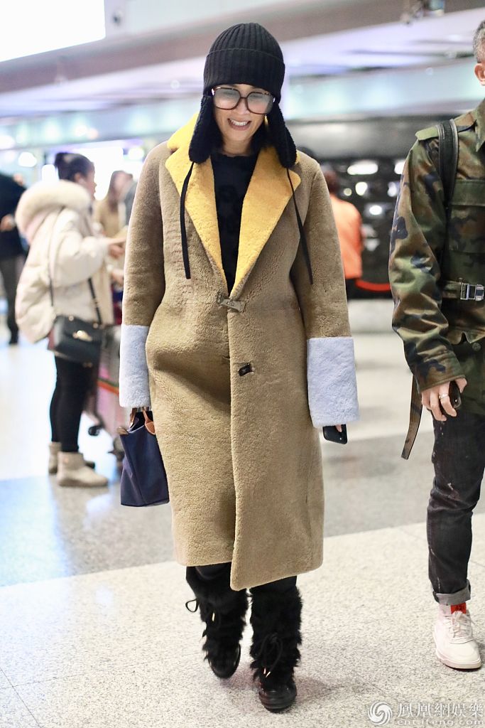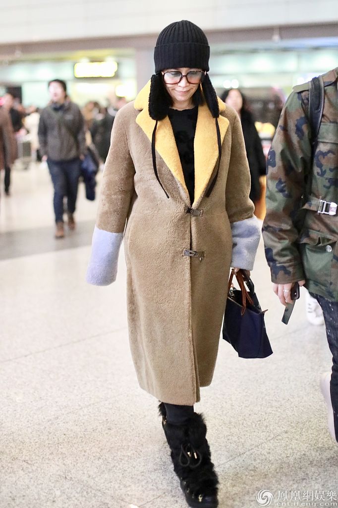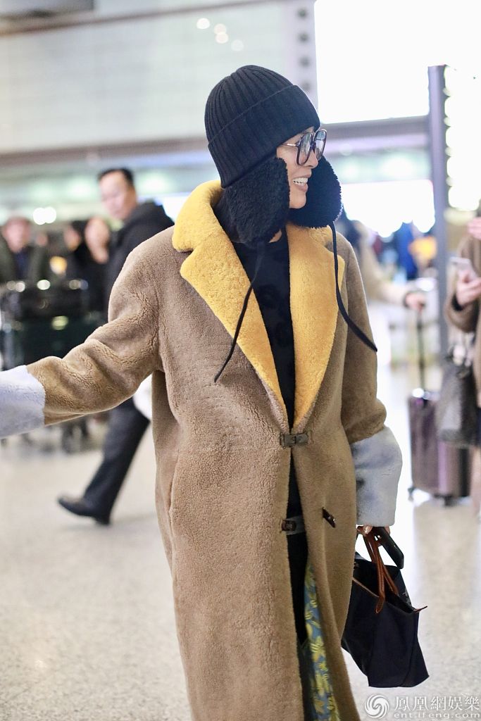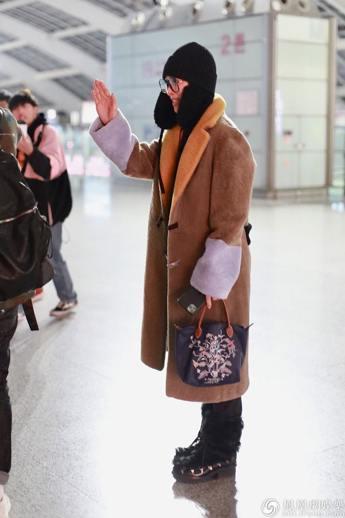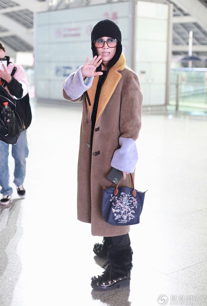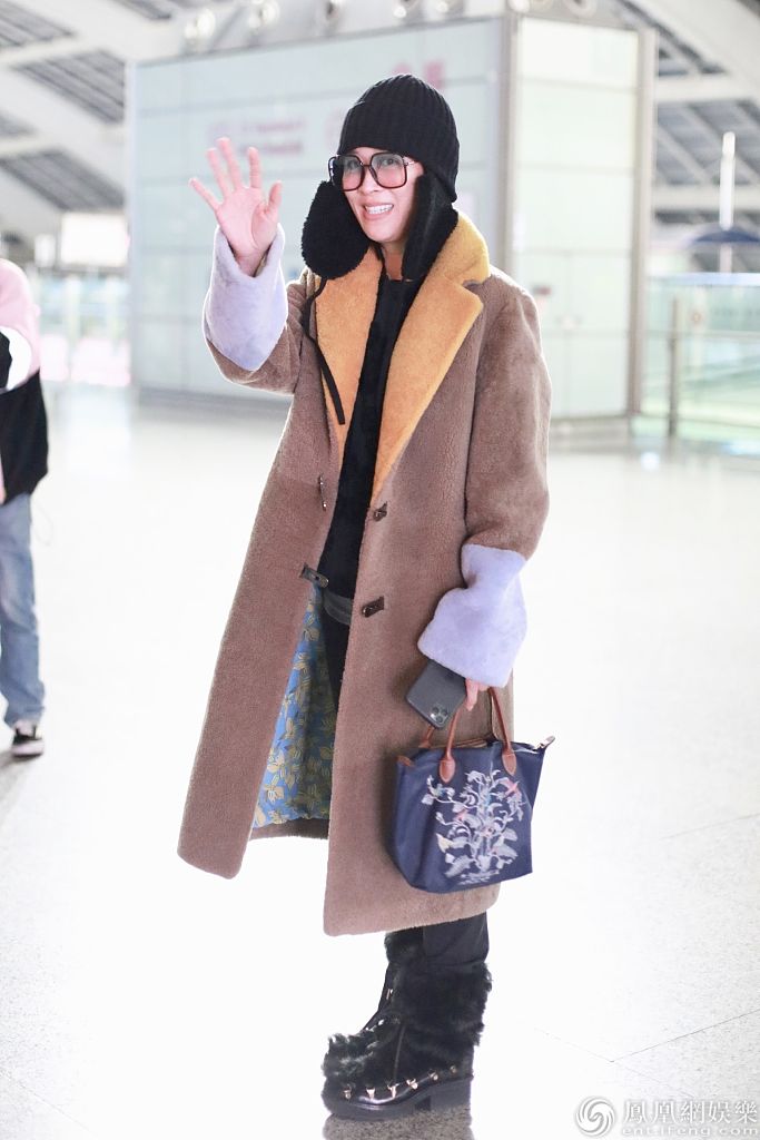 2020年1月1日,北京,那英结束跨年演出抵京亮相机场。那英身穿拼接翻领大衣气场满满,戴着针织帽保暖,见到热情粉丝亲切挥手心情大