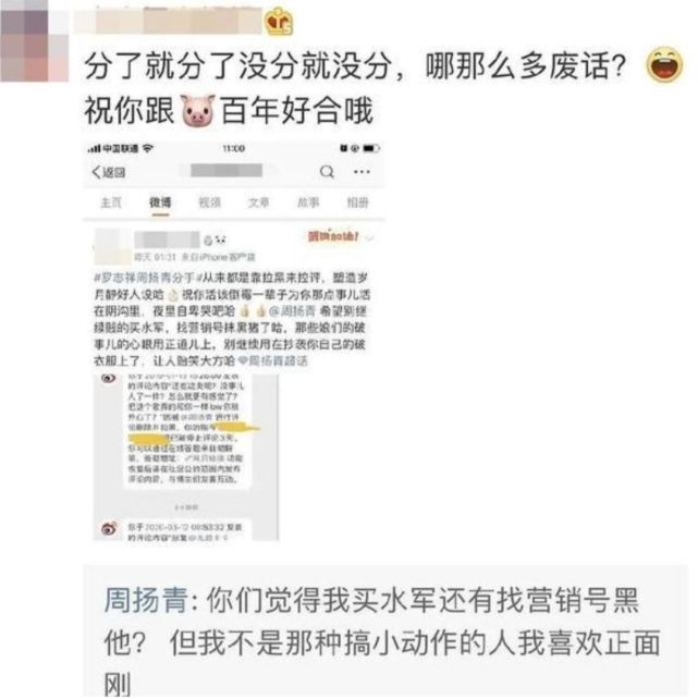罗志祥和周扬青分没分手这事还弄清楚,粉丝冲着原本就不怎么顺眼的准前嫂子发火了,“别买水军黑我哥哥!”