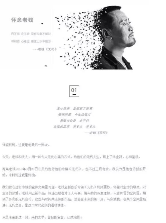 12月31日,老钱生前的唱片公司发表文章《怀念老钱》,称他和夫妻用一种令人无比心痛的方式,给他们的无朽人生画上了终止符,同时该文章还称,三个月前老钱才发行第4张EP《无朽》,本以为是他音乐新的开始,没想到居然是终曲,据悉,老钱夫妇12月29日服药自杀,并且已于12月30日火化。