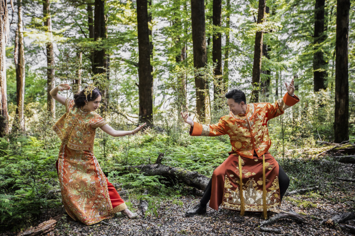 两人穿中式礼服在森林中搞怪摆武打POSE。
