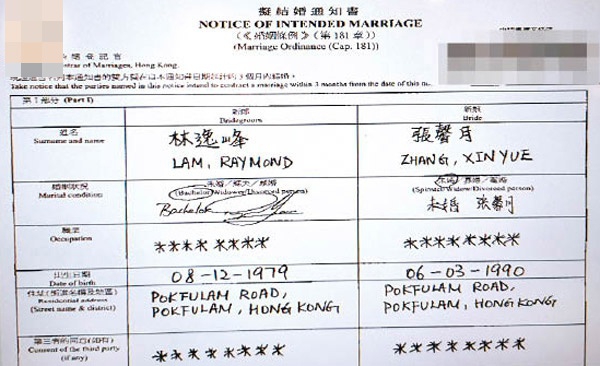 10月,港媒公开林峯他与女友张馨月的拟结婚通知书。根据规定,他们于申请日期的15天之后,3个月之内,可以正式注册结婚。随后,林峯回复港媒:“多谢大家祝福!希望大家给我们多一些空间!谢谢!”承认此事。