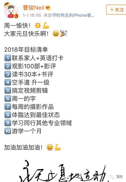 两个人都会在周一准时打卡,向元气满满的一周say hello(建议众社畜都学习一下),曹骏的周一打卡大部分是晒自己写的字。