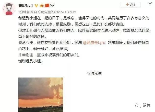 谁能想到,这对低调又甜蜜的小情侣,在今年的10月份宣布分手了,分开的过程也很平和,没撕逼,没互相打脸,曹骏发文称两人以后还是朋友,他还是会支持蓝盈莹。