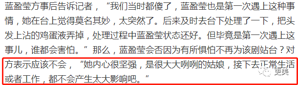 可能因为演过的反派角色深入人心,蓝盈莹不仅得了个“第一心机女”的绰号,还曾在出席活动的时候遭遇袭击事件,被情绪激烈的观众扔过鸡蛋。