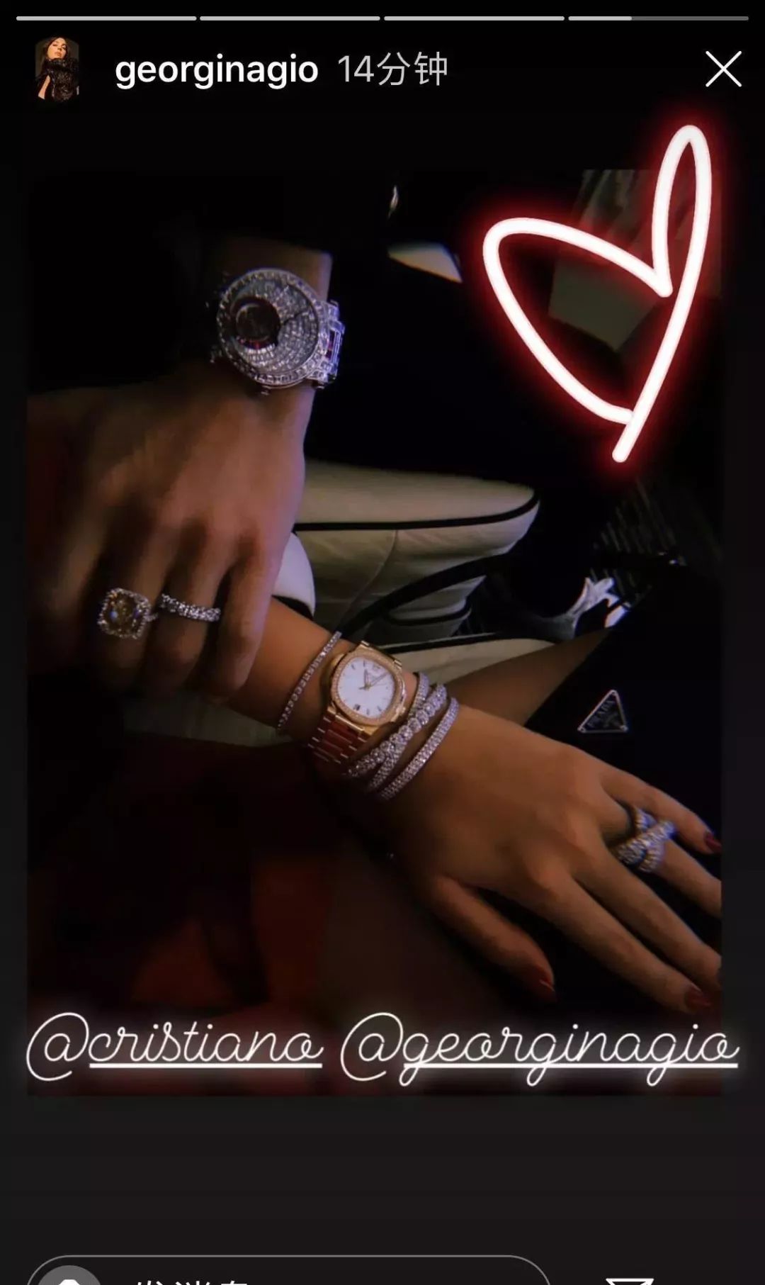 在乔治娜晒出的两人手部合照中,C罗佩戴了Jacob&Co私人定制的手表,上面镶着424颗闪闪发亮的钻石,价值高达185万英镑(约合人民币1700万元)。
