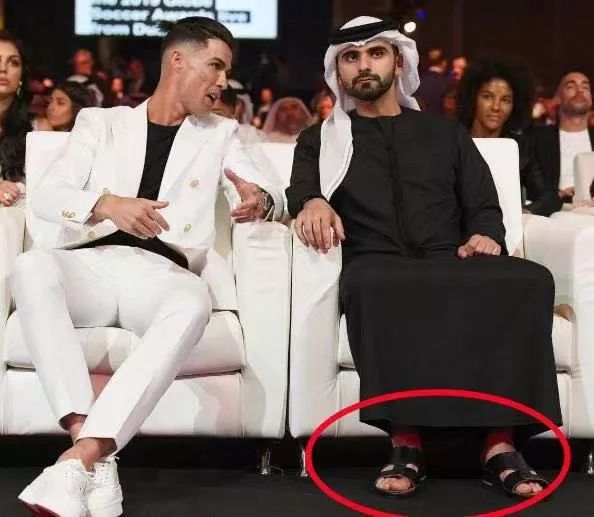就像当天颁奖典礼坐在C罗左手边的这位迪拜贵族,虽然没有像中东贵族一样高调炫富,但是他脚上那双不起眼的拖鞋却暴露了他贵族身份。