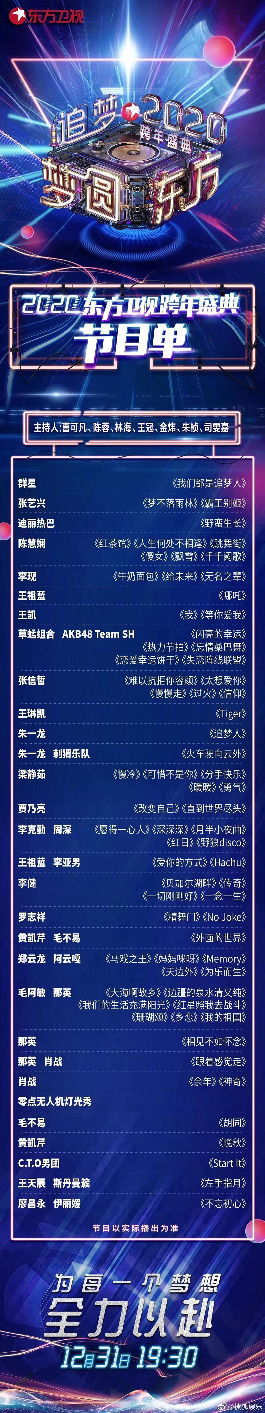 东方卫视跨年首播于12月31日晚19:30。东方卫视此次主打“梦圆东方-追梦2020”主题,不仅主题充满正能量,在嘉宾的阵容上,还把肖战、李现、朱一龙、张艺兴几大顶流都拿下了,颇有要“弯道超车”湖南卫视的意思了。