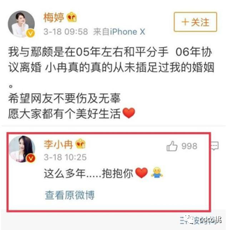 等到时移世易,鄢颇再婚,新娘却不是李小冉。而梅婷却再发微博,证明李小冉并未插足自己婚姻,为李小冉洗清名誉。而后李小冉深情回复,留下一个拥抱。