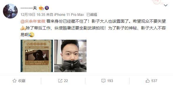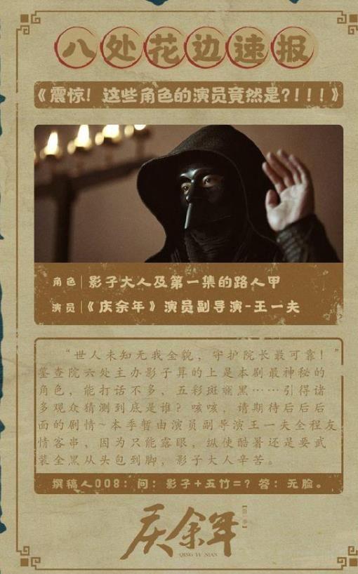 因为影子全程没露脸,所以剧组并没有刻意找演员饰演该角色,而是安排了剧组的一位工作人员客串—演员副导演王一夫,他是一位颜值的90后小鲜肉,毕业于沈阳音乐学院,除了饰演影子大人,他还在戏串客串路人甲,据其在微博透露,演影子大人并不容易,就算酷暑也要全副武装。
