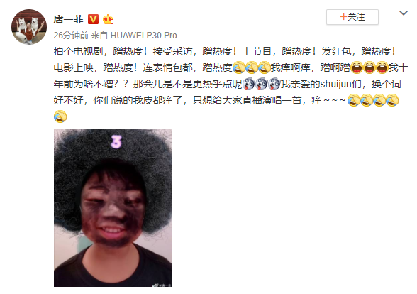 12月30日,唐一菲发文霸气回怼“开微博蹭热度”的传闻,她上传了一张儿子的搞怪爆炸头滤镜照片并发文:“拍个电视剧,蹭热度!接受采访,蹭热度!上节目,蹭热度!发红包,蹭热度!电影上映,蹭热度!连表情包都,蹭热度。我痒啊痒,蹭啊蹭。我十年前为啥不蹭??那会儿是不是更热乎点呢?我亲爱的shuijun们,换个词好不好,你们说的我皮都痒了,只想给大家直播演唱一首,痒~~~”。