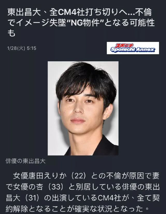 不过,有一点值得欣慰的是,东出婚外情被曝光后,四家广告商和他解除了合约,东出将赔偿广告商三倍薪酬的违约金,金额高达6亿日元。
