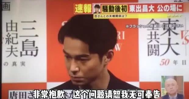 东出昌大在采访一开始就对着镜头开始鞠躬致歉,先是给记者和媒体带来麻烦表示抱歉,接着对一直支持自己事业的妻子抱歉,不应该背叛她。
