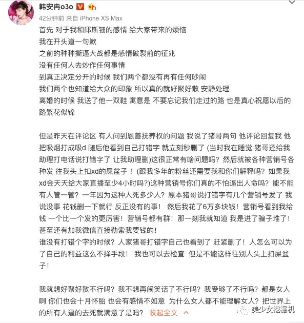韩安冉也发长文,痛骂营销号圈钱无底线。(营销号也说小猪是收了韩安冉的钱才改口)