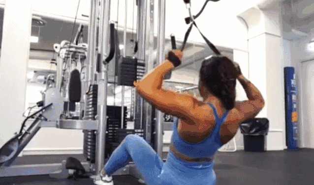 2、身体后仰,胸椎顶出,向两侧拉动滑轮