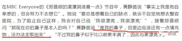 对于这件事,黄静茵之前也在节目里自曝过原因:自己曾对自己外貌有自卑感,但一直用自我催眠的方法告诉自己我很漂亮,同时也承认自己的鼻子里有填充物,也因此变得更漂亮了···