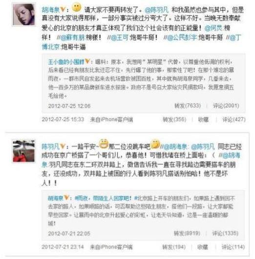 2012年7月,北京遭遇强降雨,录完节目开车回家时,陈羽凡胡海泉向多位无助的行人伸出援手,载他们安全到达目的地。