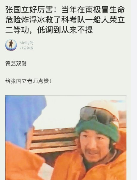 同时该文章还写道,张国立在上岸后又干起了混凝土工,电焊工和搬运工,参与建设南极中山站,1989年中山站建成典礼时,张国立又担任升旗手,让五星红旗在南极飘扬,文章最后对张国立给予高度赞扬:“这个时代向来不缺高调没实力的人,缺的是那些低调却有实力的人。起码,张国立实至名归。”