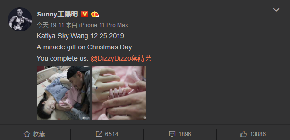 25日晚,王阳明官宣老婆蔡诗芸产下女儿,并且晒出一家三口全家福。照片中蔡诗芸和宝宝躺在床上,王阳明则一脸温柔地看着老婆和孩子。