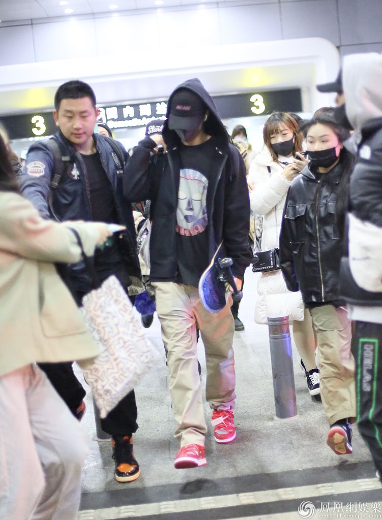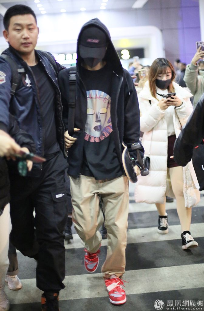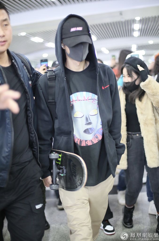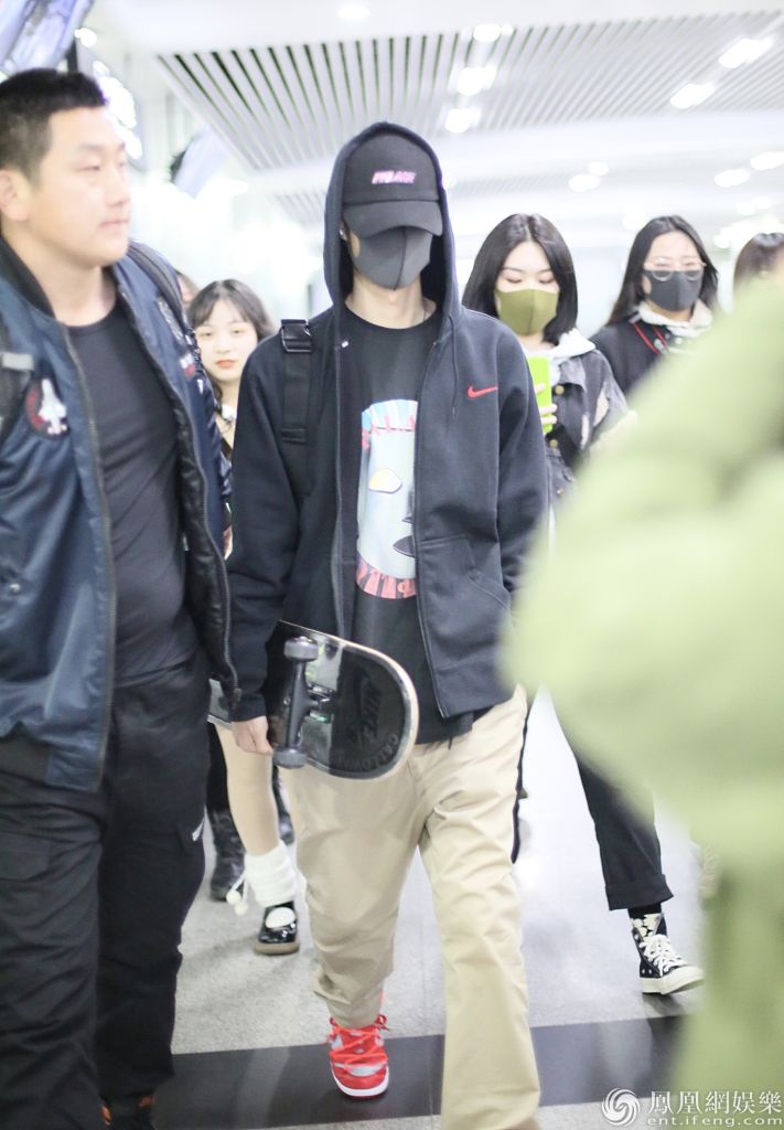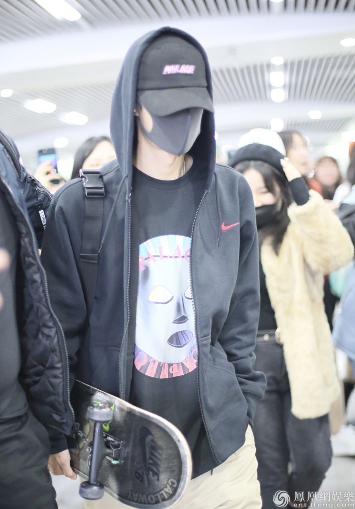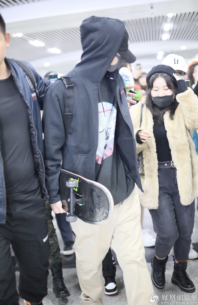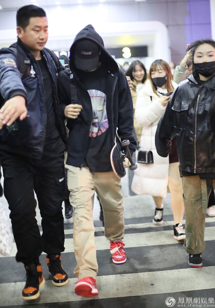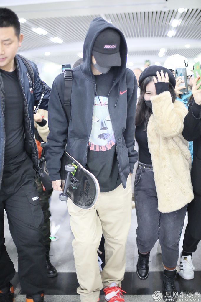 2019年12月26日,长沙,王一博现身机场。他身穿休闲外套低调帅气,即便已到凌晨,仍有半百迷妹前来接机,全副武装的他手拿滑板,粉丝则自发组成人墙为偶像保驾护
