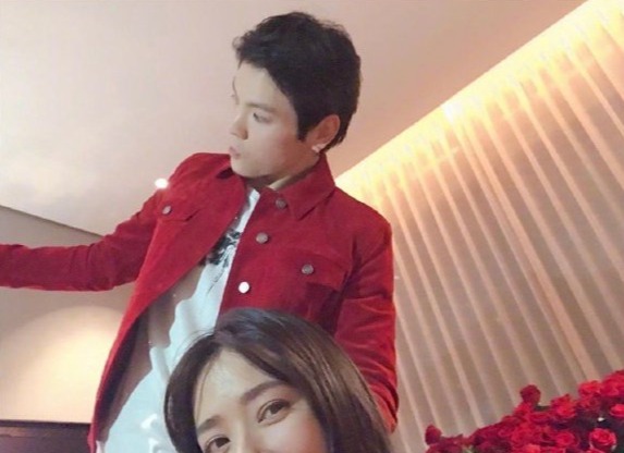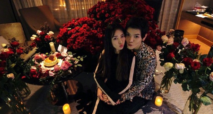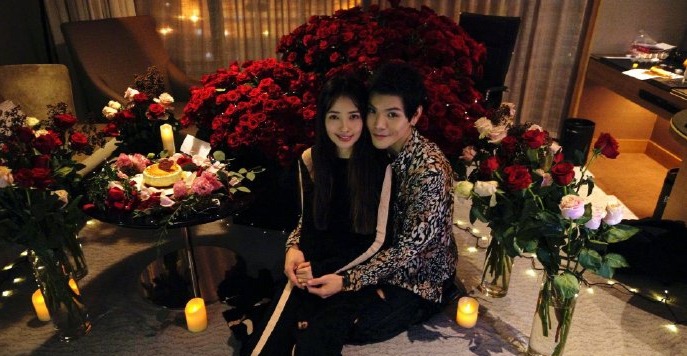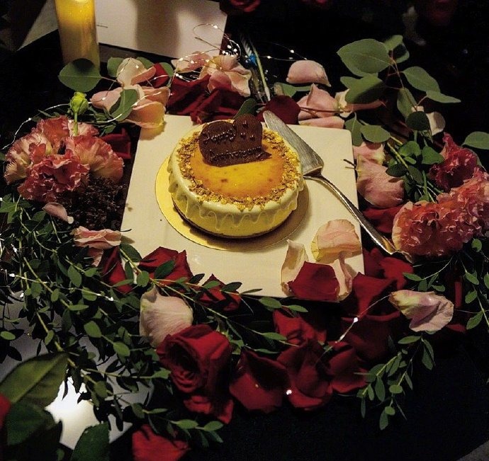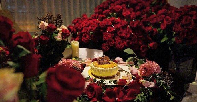 照片中,向佐郭碧婷坐在一堆玫瑰花里,亲密拥抱、相互对视,还做鬼脸嘟嘴,甚是甜蜜。