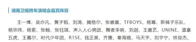 要知道芒果台今年的跨年演唱会阵容可是堪称历史最佳,目前已经官宣的明星已经是所有电视台中最多的,其中不韩红、郭富城这样的时代经典,林俊杰、华晨宇、张碧晨这样的实力唱将,以及刘涛、杨幂、杨紫、张翰这样的知名演员。
