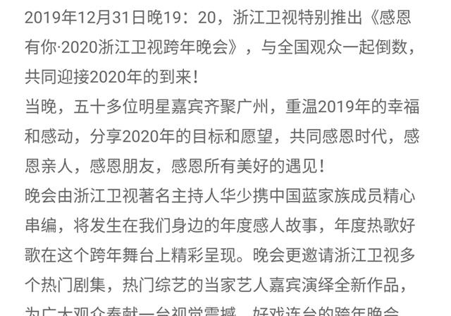 根据售票平台的演出介绍,浙江卫视今年的口号是“三年领跑,跨年回归”。这场晚会将主打“感恩牌”,主持人华少将和超过50位明星将会在现场重温2019年的幸福和感动,并展望2020年的目标和愿望。“感恩”没有错,但是从蓝台嘴里说出来,却略显讽刺。
